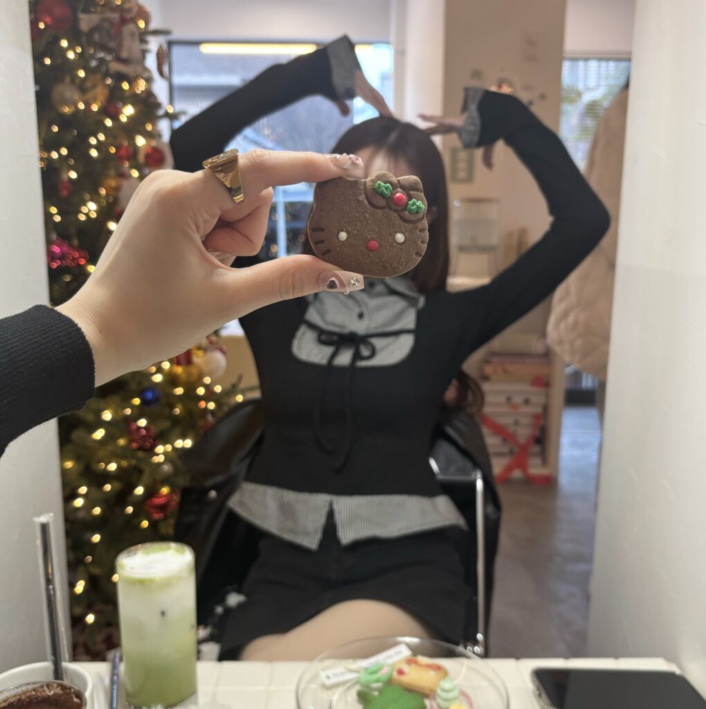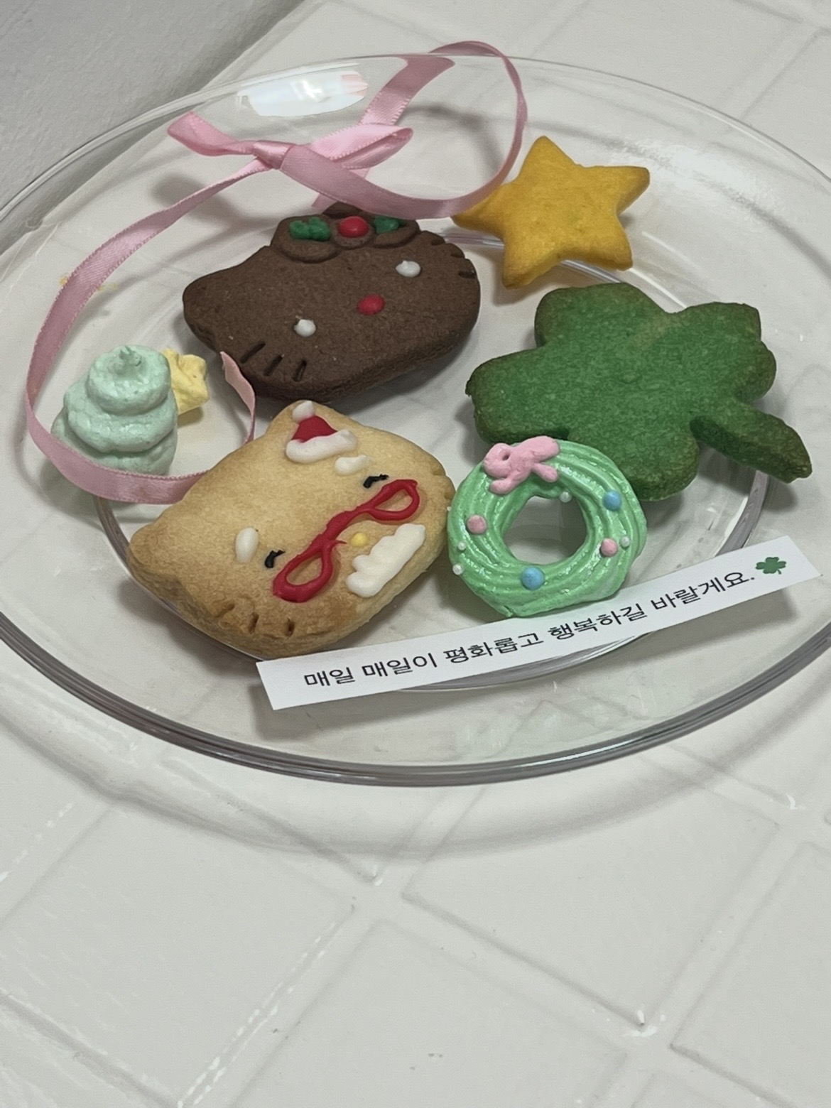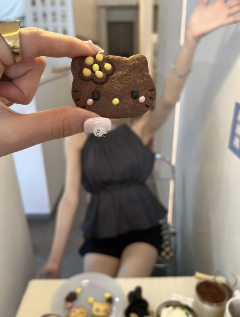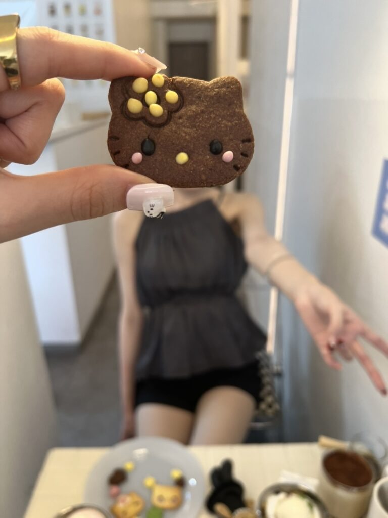One plate had adorable decorated cookies, including a Hello Kitty design with tiny details that made it almost too cute to eat. The pastel colors and simple glass plate made the whole scene feel calm and balanced.