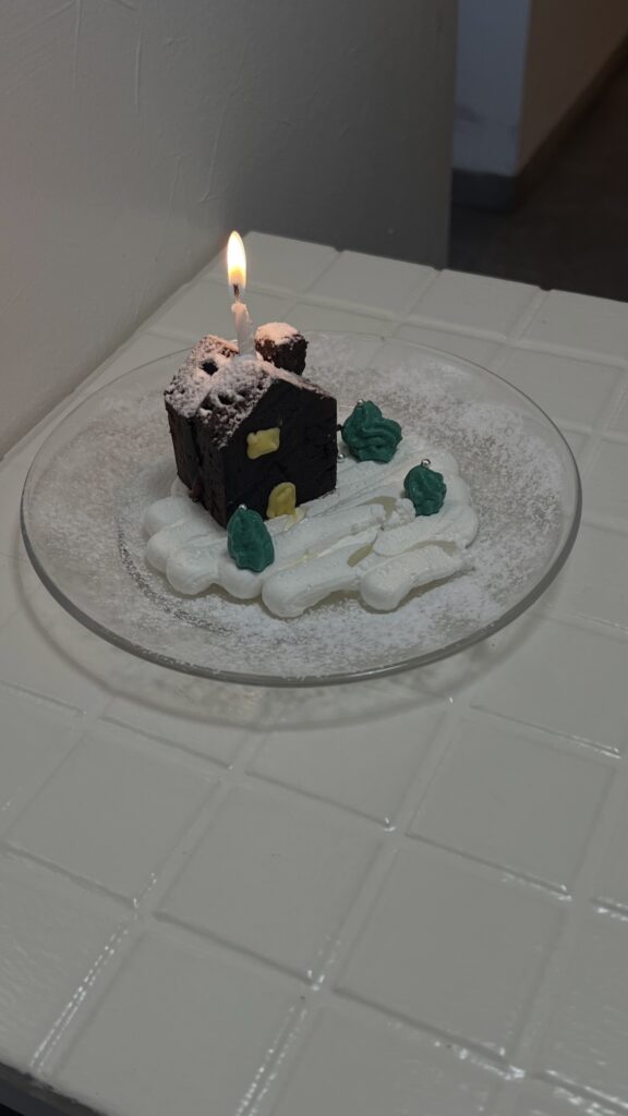 Another dessert looked like a tiny house covered in powdered sugar, like a quiet winter scene. The soft lighting and minimal background made it even more special — almost like a moment frozen in time.
