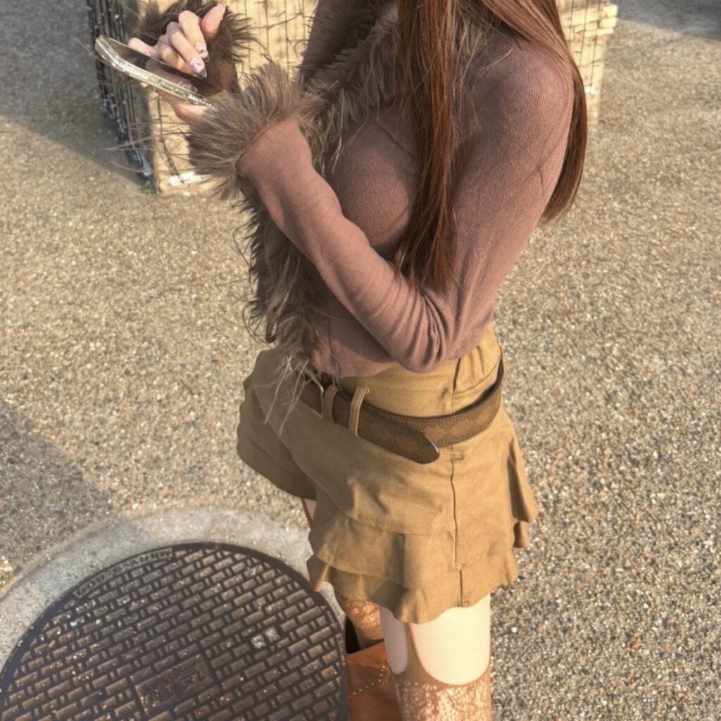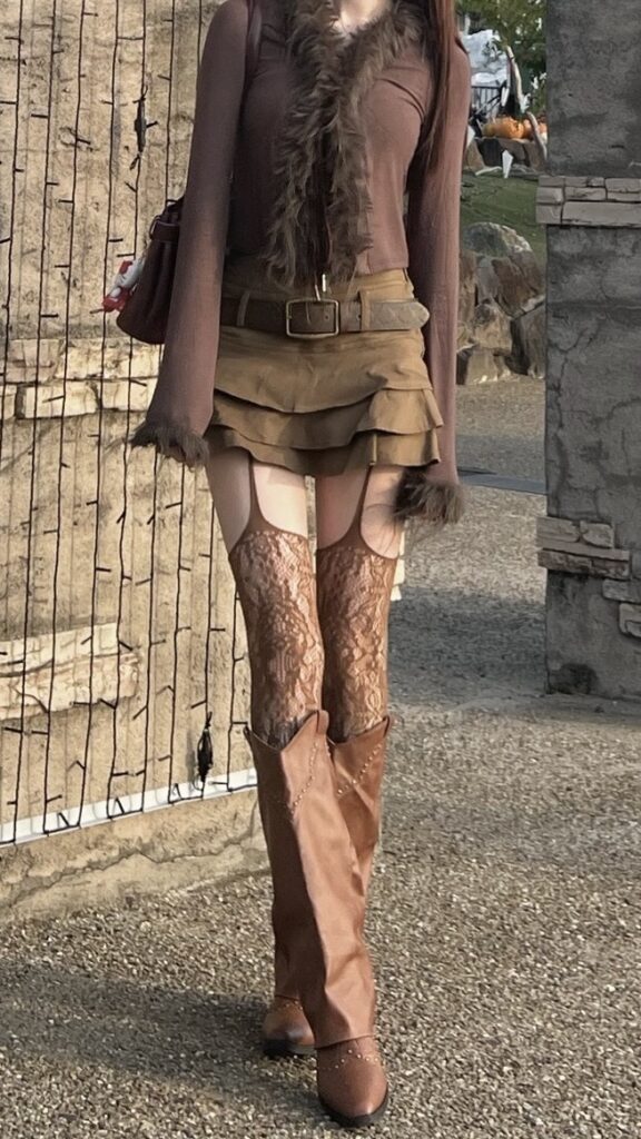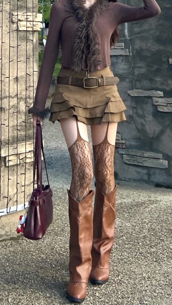 The look combines a fitted brown top with a layered mini skirt and a wide belt that adds structure to the outfit. The lace stockings give a delicate and elegant vibe, while the long brown boots create a balanced and trendy silhouette.