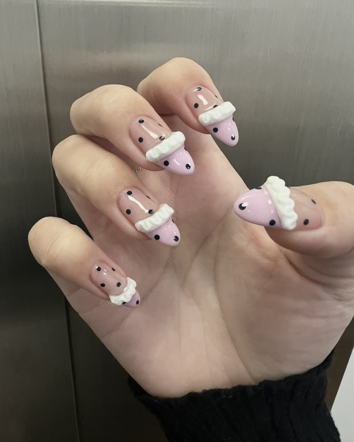 This nail design features a soft pink and nude base combined with playful polka dots and 3D frill accents.