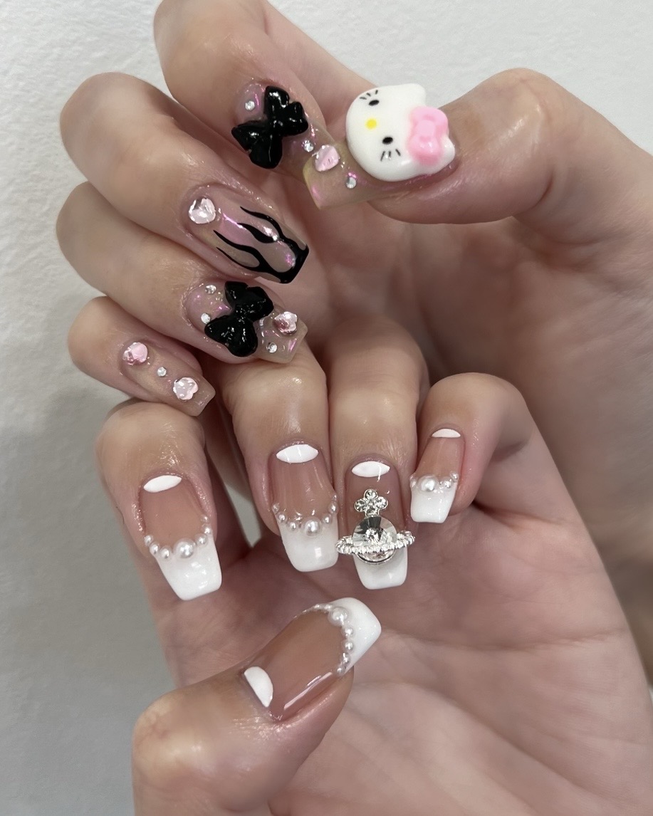 What I love most about this look is how it mixes different styles into one cohesive design. The classic white French tips create a clean base, while the 3D charms and details add a fun, eye-catching twist.