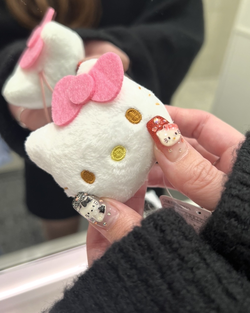 I found the cutest little Hello Kitty plush charm, and I couldn’t resist taking a photo with my matching nail design.