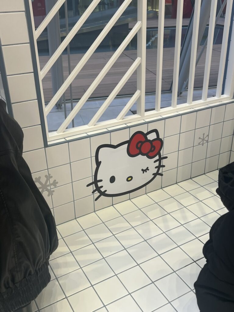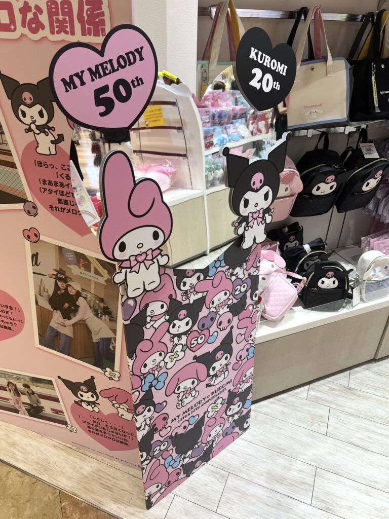 Inside, you can spot displays celebrating different Sanrio characters like My Melody and Kuromi — including anniversary visuals (like My Melody’s 50th and Kuromi’s 20th!).